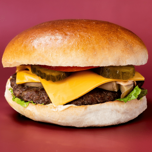 Rundvlees, sla, tomaat, kaas, augurk, mosterd saus, M&Z saus, BBQ saus en uien