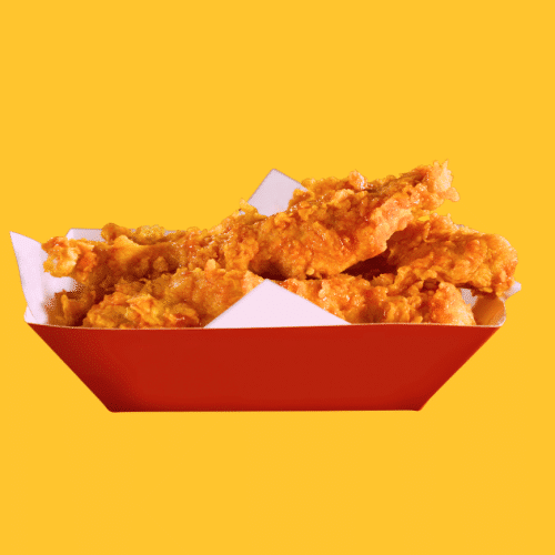 Kip tenders, friet, sla, augurk, tomaat, M&Z saus en chilli saus. Inclusief een kleine friet en een drankje naar keuze